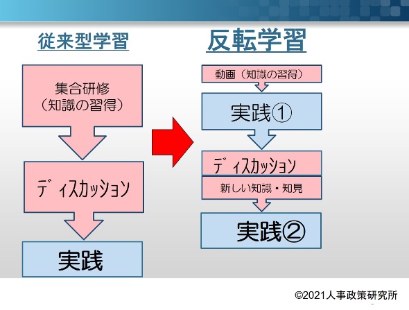 人事コンサルティングの分野、特に教育の分野では「反転学習」という言葉が使われている。従来型の学習は、集合研修でディスカッションを行い実践する。反転学習では、まず短い動画を見せ、すぐに実践し、ディスカッションを行って、再度実践する。これにより、Off-JTの時間を短くすることができるメリットがある。