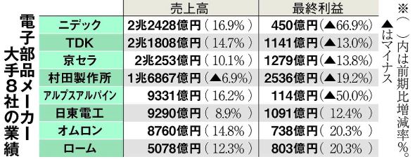電子部品大手8社の令和5年3月期連結決算が15日、出そろった。売上高はニデックや京セラなどが初の2兆円を達成するなど、7社が過去最高を更新した。パソコンやスマートフォン需要の低迷で下期は多くの企業が失速したが、円安だった上期が業績を牽引(けんいん)した。