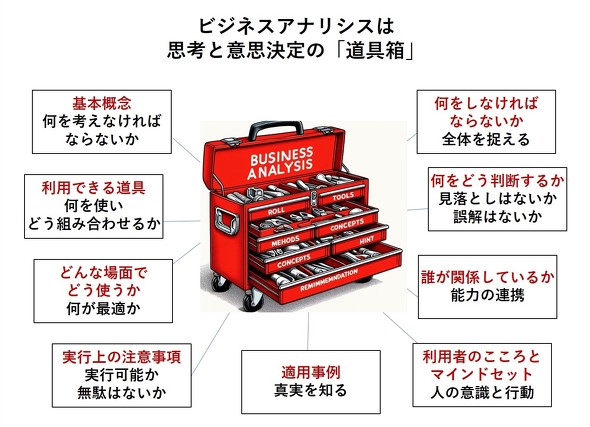 ビジネスアナリシスの実行には特別な理論や手法はなく、日常利用している思考と行動の手法と、それらの利用上の知恵と情報が詰まっている「道具箱」だと考えるとよいでしょう。