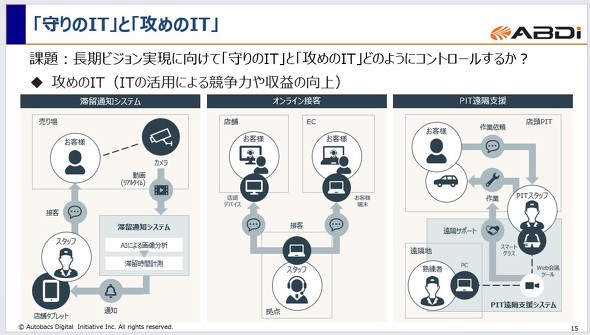 一方、攻めのITでは、来店したお客様の動向を動画で撮影し、AIでリアルタイムに画像分析を行い、最適なタイミングで接客するための「滞留通知システム」や、専門的な知識を持つスタッフを本部のコンタクトセンターに配置し、店舗スタッフが対応できないときにオンラインでお客様の問い合わせに答える「オンライン接客」、ピット担当の店舗スタッフだけでなく、本部の熟練者がピットからのさまざまな問い合わせに対してリモートで回答する「PIT遠隔支援」などの仕組みを構築している。