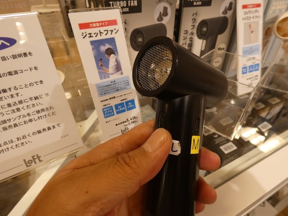 手持ち型の「多機能ジェットファン(扇風機)」は手にすっきり収まるサイズにもかかわらず、最大出力で風速約10メートルの風を送り出す。顔に当てると息ができないほどの強さだった。