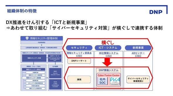 サイバーセキュリティ関連の施策を迅速に進めるため、DX推進を牽引するICT・システムと新規事業、サイバーセキュリティの3つの組織が連携し、CISOが横串的に統括する形を取っていることが、DNPの大きな特徴となっている。