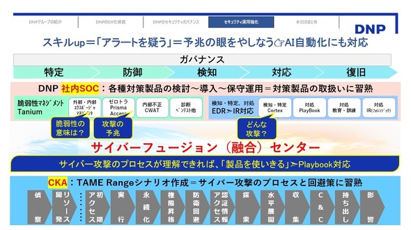こうした示唆も踏まえつつ、DNPでは「サイバー攻撃のプロセスを理解した効果的なセキュリティ運用」と、「製品構成をベストオブブリードから統合プラットフォーム化し、徹底的に使い切ることによる迅速なセキュリティ運用」の2つが必要だと考え、取り組み始めたところだ。