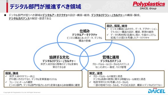 ポリプラスチックスでは、デジタル部門が推進すべき領域として、「デジタルアーキテクチャなどの仕組み」「デジタルリテラシーやカルチャーなどの協調する文化」「デジタルガバナンスの管理と運用」の3つを挙げ、そのバランスを重視しているという。データプロジェクトも同様で、事業戦略や経営戦略に基づいてデータ活用の戦略を立案し、実践するが、仕組み、協調する文化、管理と運用の3つの領域でさまざまな取り組みを進めている。
