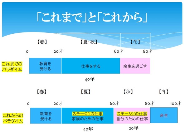 この2人の事例を踏まえて、吉田氏は、従来の人生設計と人生100年時代の人生設計の違いを整理してみせた。かつての前提は、20歳まで教育、60歳まで仕事、その後は余生という直線的な流れである。約40年間の労働期間をどう乗り切るかという発想だった。