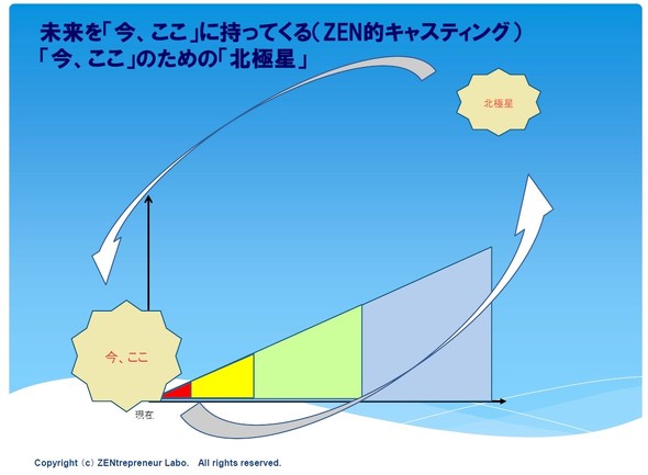 2つ目は、「禅的思考」で人生を考えた結果である。禅とは、手放して今、ここに集中することだと吉田氏は説明する。ビジネスの世界では、ゴールから逆算するバックキャスティングがよく語られるが、吉田氏はそれとは異なる「禅的キャスティング」という概念を提唱する。北極星のような方向性を1つ定め、そこに向かって「今、ここ」を一生懸命生きる。目標のために今があるのではなく、「今、ここのために北極星がある」という考え方である。結果に支配されるのではなく、今この瞬間をどう生きるかを中心に据える。