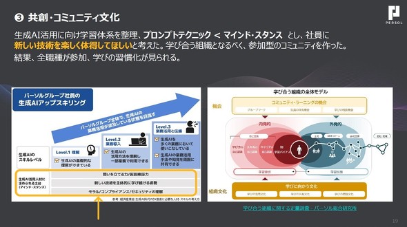 「共創・コミュニティ文化では、経済産業省が公開している『生成AI時代のDX推進に必要な人材・スキルの考え方』に基づき、生成AI活用人材に求められる土台(マインド・スタンス)が重要と考え、モラル/コンプライアンス/セキュリティ、新しい技術を主体的に学び続ける姿勢、問いを立てる力/仮説検証力といったスキルが必要になると考えました。パーソル総研のリサーチでは、学び合う組織として必要なのは“学びに向かう文化”であり、これを1人で実現するのではなくコミュニティ・ラーニングにより支えていくことが必要になると報告されています」(朝比奈氏)。