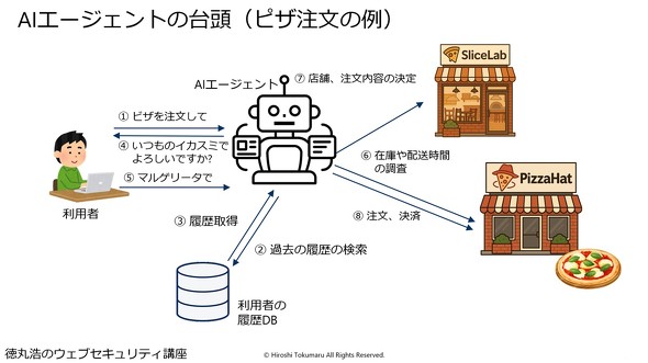徳丸氏は、IT業界の習いに従って「ピザ」を例に取ってAIエージェントの利点を説明した。AIエージェントならば、利用者がただ「ピザを注文してほしい」と依頼するだけで、過去の利用履歴やリクエストと、ピザショップの在庫状況や価格などを調べた上で最適な店舗や注文内容を決め、注文を行える。「これはあくまで例で、事務用品の注文といった日常業務の自動化に直結します」と徳丸氏はその利点を説明した。