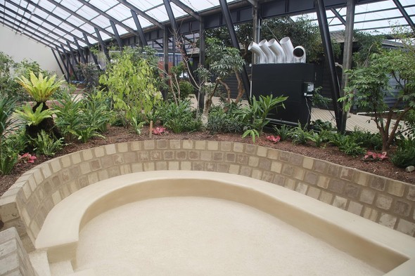 国や地域の垣根なく、気候と生活の共通性を軸に植物を選定した庭エリアは、東・東南アジアの観葉植物が一面に広がります。