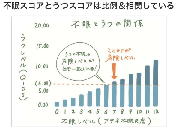 「不眠症レベルの7割の人が、自分が睡眠不調だという自覚がないことも問題です。不眠スコアとうつスコアは比例していて相関関係があります。うつの一番の要因が不眠なので、不眠レベルが上がるとうつレベルも上がっていきます。睡眠改善して不眠症を解消することが重要です」(角谷氏)