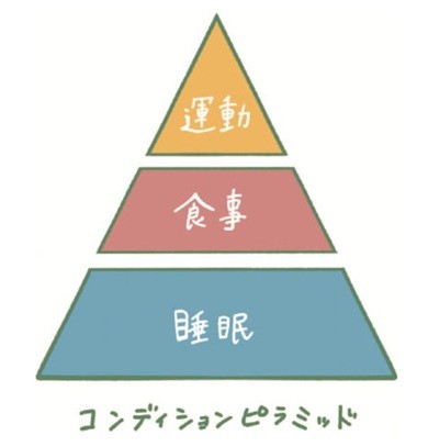 角谷氏はもともとトレーナーをしていたが、運動・食事・睡眠の中で睡眠がもっとも改善効果が高いという理由で睡眠に特化した睡眠コーチに転身したという。人間の体を改善する場合、まずきちんと睡眠をとる、それから食事を改善し、その後に運動をするというコンディションピラミッドが重要になる。