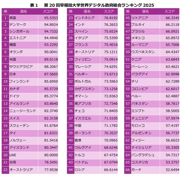 早稲田大学総合研究機構電子政府・自治体研究所は、デジタル先進国66カ国・地域を対象に、デジタル政府の進捗度を主要10指標で評価した、「第20回早稲田大学世界デジタル政府ランキング2025」を発表した。